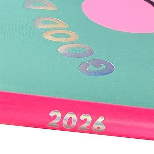 カラフルでポップなイラストがHAPPYな気持ちにさせてくれるダイアリー。表紙にオーロラ箔を使用していて、キラキラ感を演出します。各ページに異なるデザインが施されていて、ページを開くのが楽しくなりそうです。 B6サイズでたっぷり書き込め、ビジネスからプライベートまで幅広くご使用いただけます。ビニールカバー付きなので汚れても安心です。