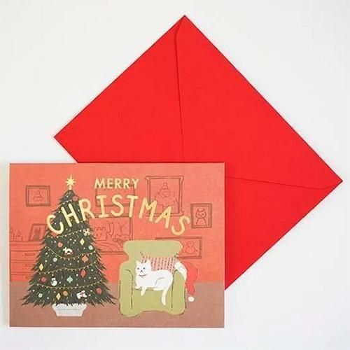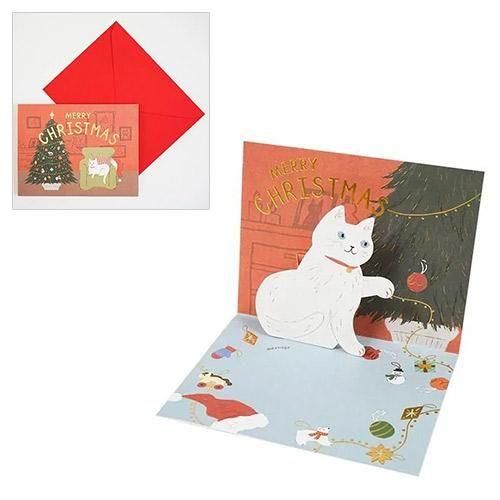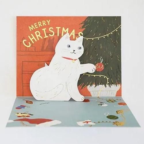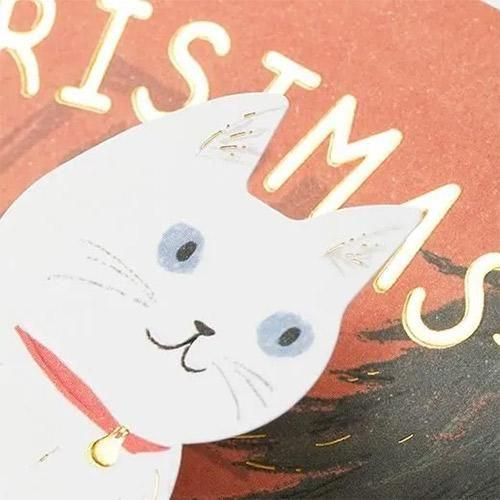 ネコ好きの心にささる「いたずらっこのネコ」の立体クリスマスカードです。光沢を抑えたゴールド箔押し加工が施されています。