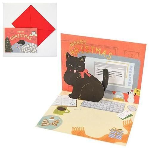 ネコ好きの心にささる「いたずらっこのネコ」の立体クリスマスカードです。光沢を抑えたゴールド箔押し加工が施されています。