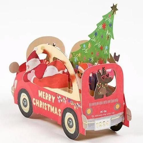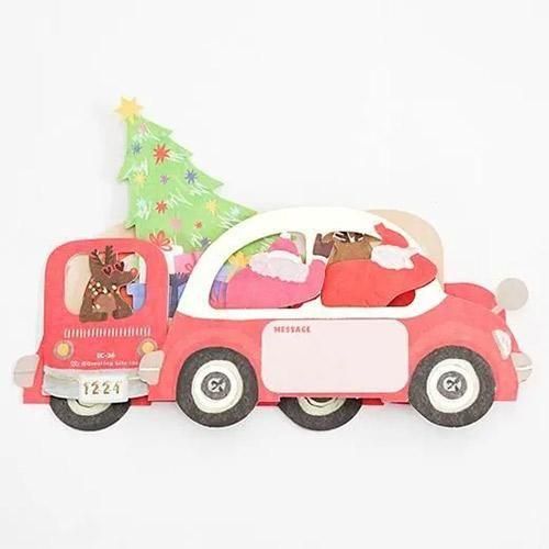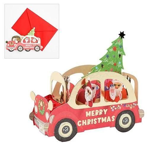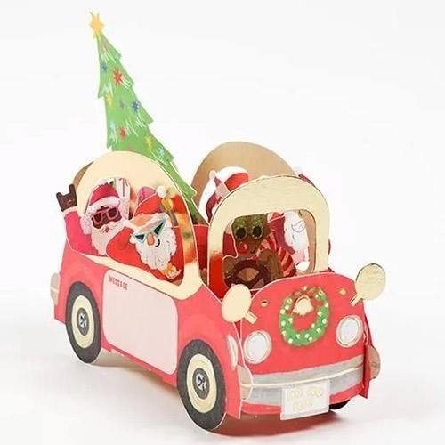 陽気なサンタたちが車にのってパーティーをしてるポップアップカード(立体カード)です。ゴールド箔押し加工が施されたカードです。