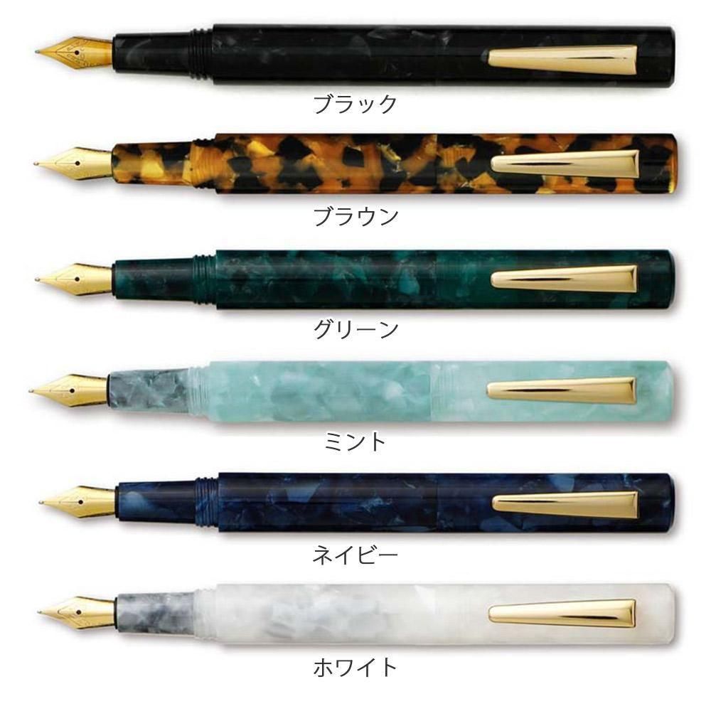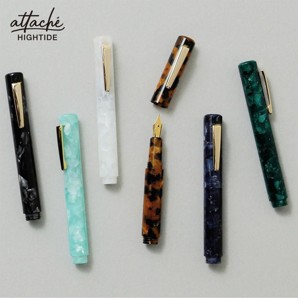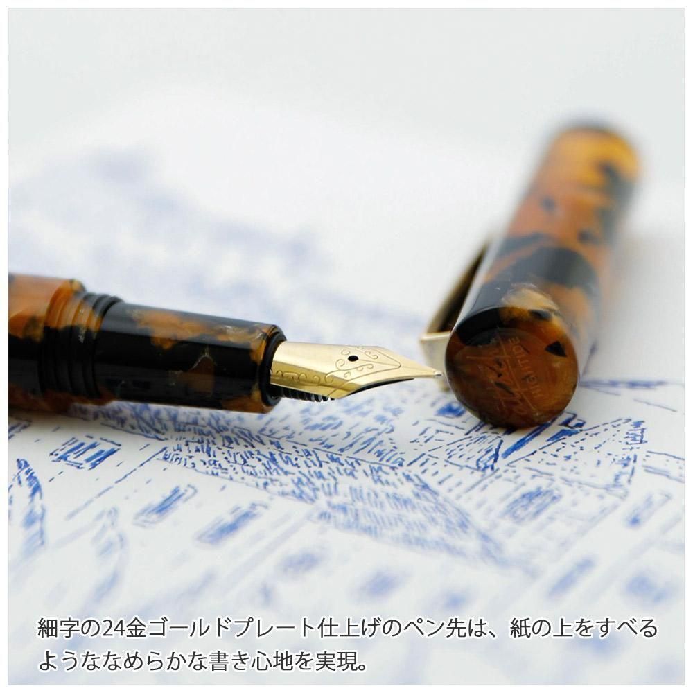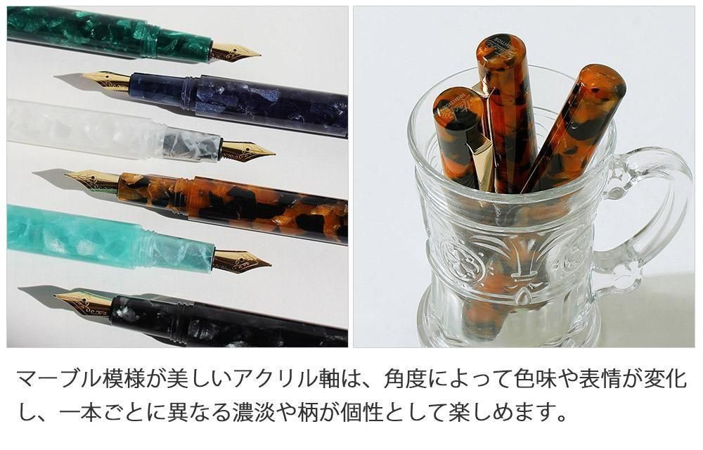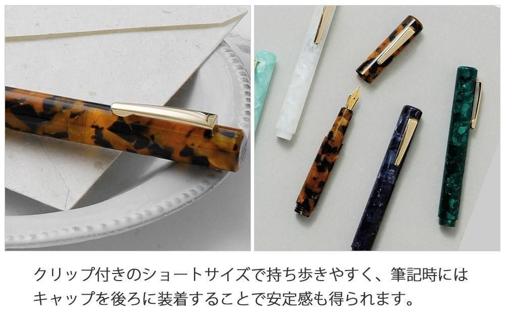 マーブル模様が美しいアクリル軸は、角度によって色味や表情が変化し、一本ごとに異なる濃淡や柄が個性として楽しめます。細字の24金ゴールドプレート仕上げのペン先は、紙の上をすべるようななめらかな書き心地を実現。クリップ付きのショートサイズで持ち歩きやすく、筆記時にはキャップを後ろに装着することで安定感も得られます。