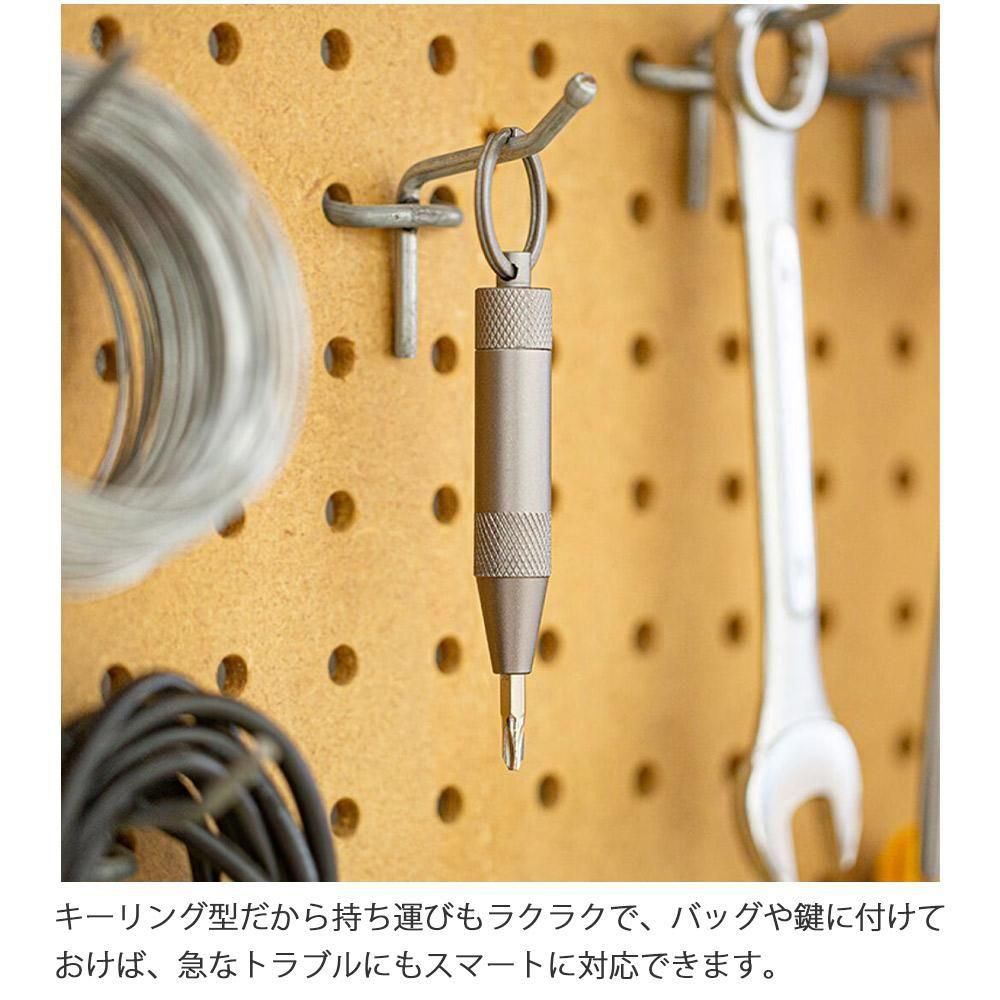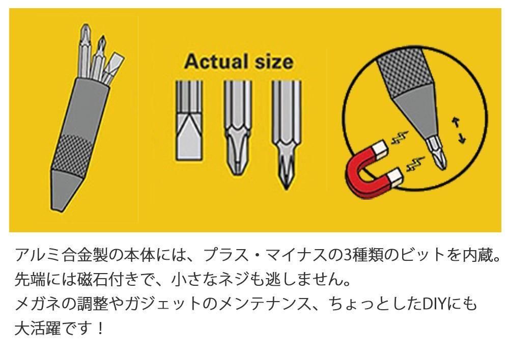 アルミ合金製の本体には、プラス・マイナスの3種類のビットを内蔵。先端には磁石付きで、小さなネジも逃しません。メガネの調整やガジェットのメンテナンス、ちょっとしたDIYにも大活躍です!